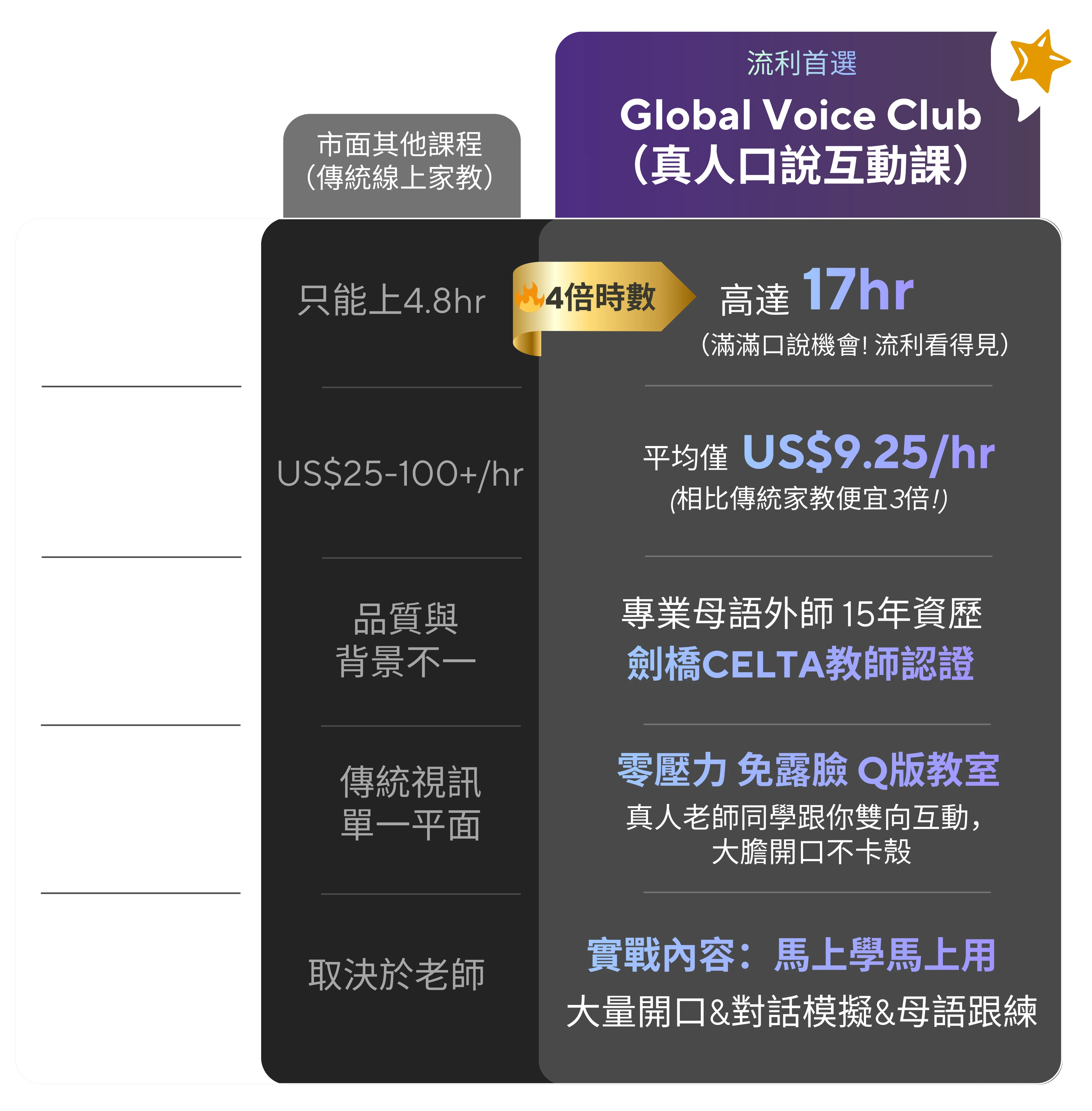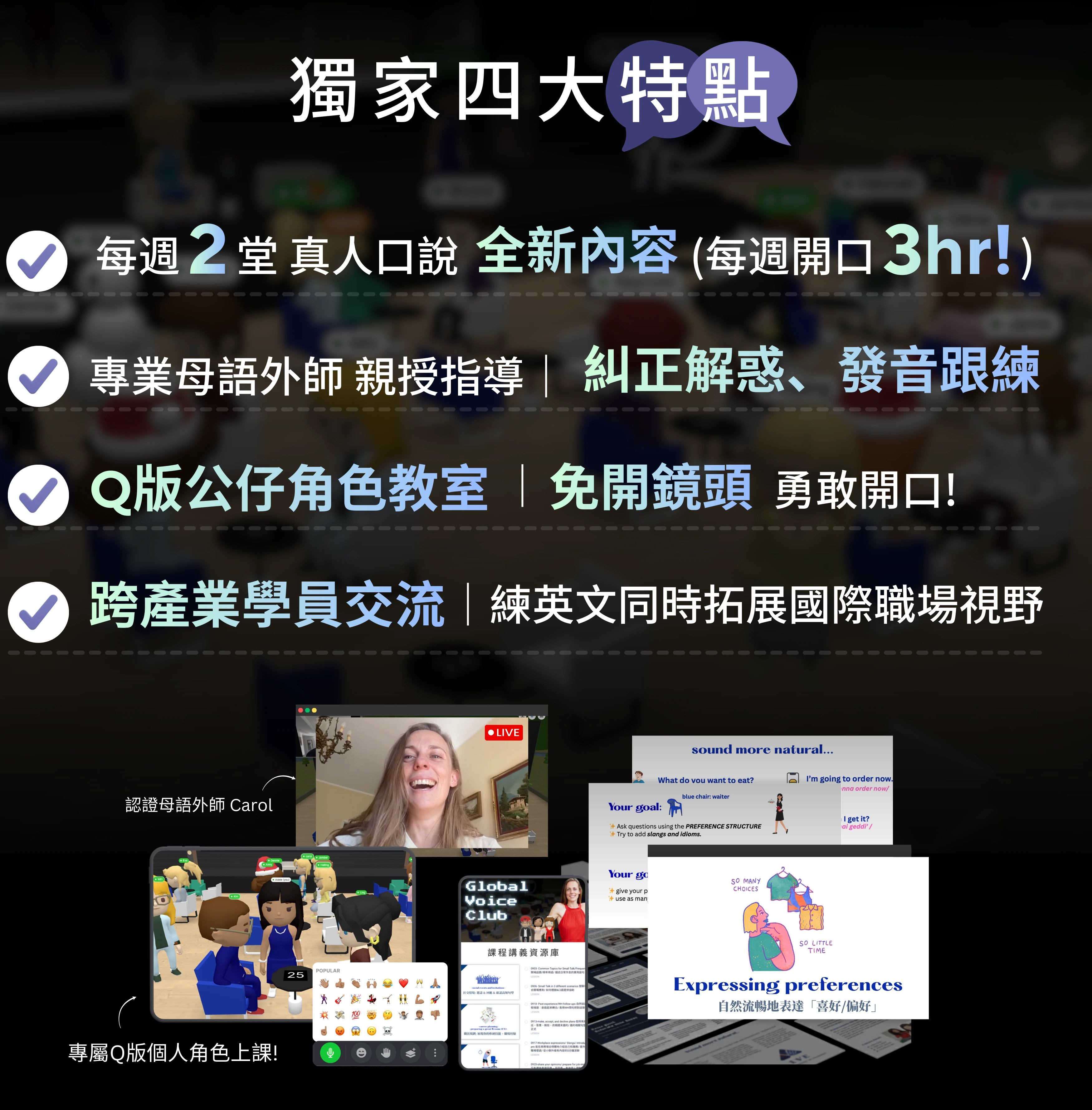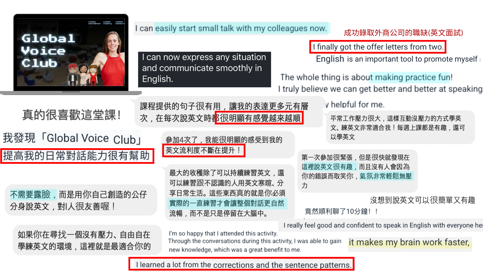 "嘗試過很多英文平台,直到加入Global Voice Club 才發現 說英文可以很生動有趣! 短短4週,我感受到明顯的流暢度提升,現在遇到外國人直接聊10分鐘! " - Ina (行銷業務)