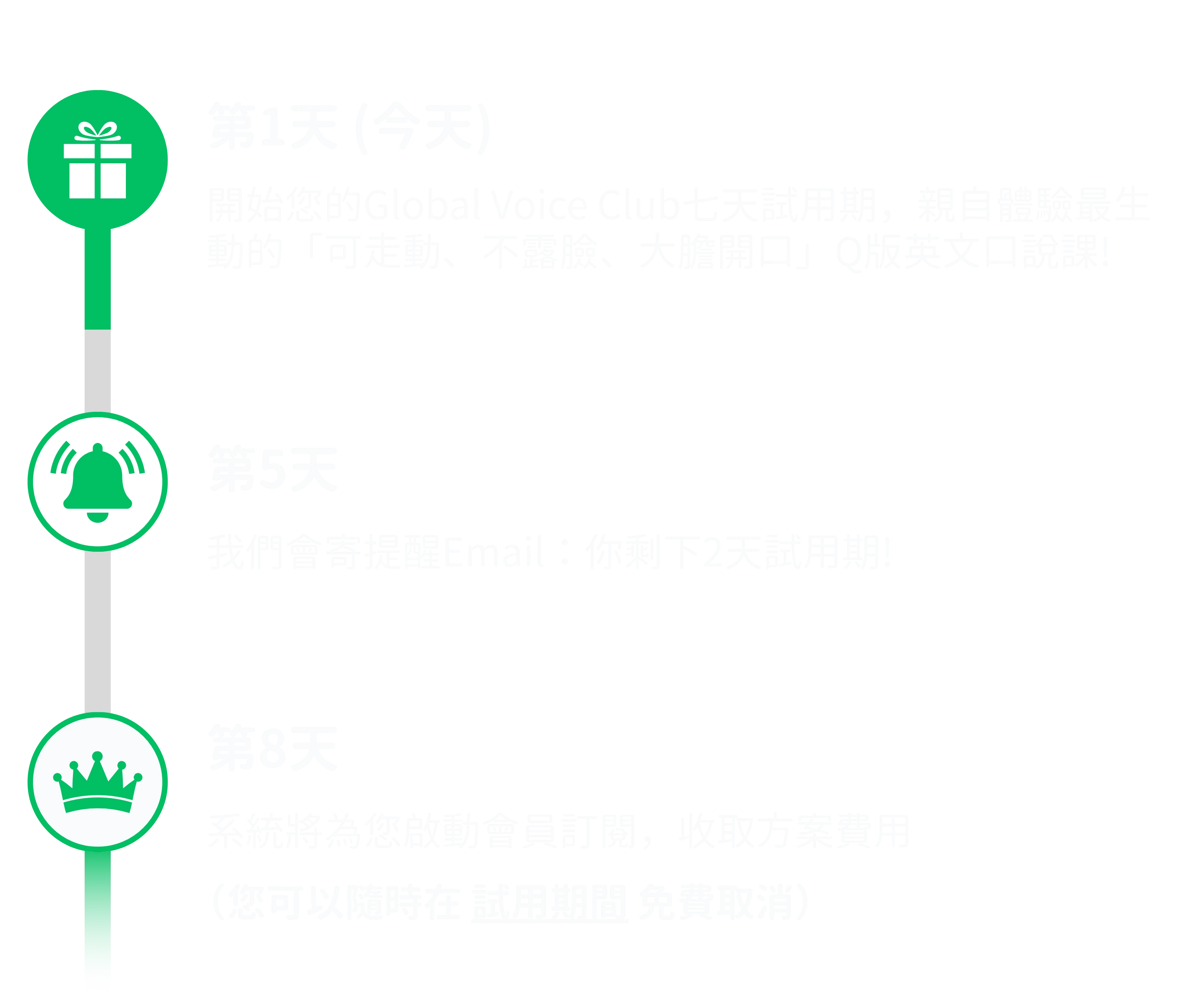 試用期為 7天免費,你能夠免費參與Global Voice Club 真人口說課程,您可以在試用期間內隨時取消,不會被收取任何費用。